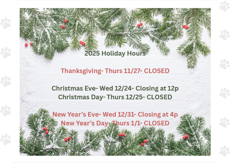 For updated information on storm closings, power/phone outages, and special holiday hour announcements, please check our Facebook page or call us prior to visiting. Click for Emergency Veterinary Care information.